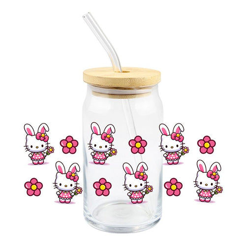 H Kitty with Bunny Ears & Pink Flowers - UV DTF 16 oz Cup Wrap